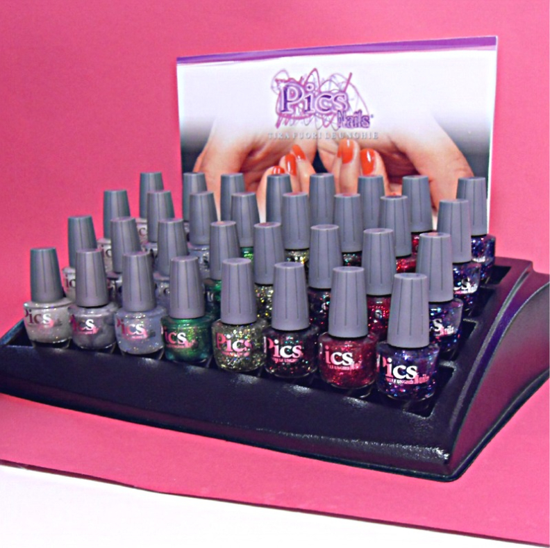 We have created Fashionable Colour Racks which are very practical: they contain 32 traditional nail polishes with 4 pieces for a total of 8 colours. A vaste selection of traditional Nail Polishes in elegant 15 ml bottles with professional brush, capable to comply with the desires of the most demanding customers;