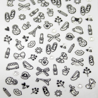 Adesivi per unghie di diversissime fantasie di colorazione nera. Impreziosiscono con facilità il lavoro di ricostruzione e di manicure. Facilissimi da applicare in quanto già dotati di adesivo Aiutandosi con una pinzetta e si applicano sull'unghia con una leggera pressione. Per aumentarne la durata si può aggiungere o un punto di colla o stendere sopra un velo di TOP COAT PICS NAILS che oltremodo rende la Nail Art maggiormente luminosa e lucida. Si eliminano strofinando delicatamente con del cotone pressato imbevuto di solvente senza acetone.