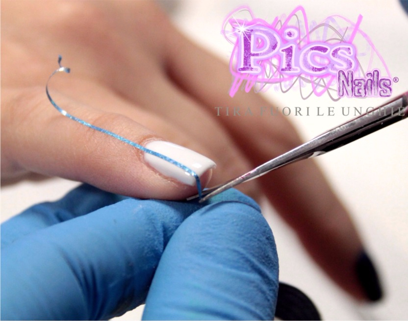 Eliminiamo con cautela e precisione, sempre con l'ausilio delle nostre Forbicine, tutti gli eccessi delle Strisce Adesive Nail Art applicate (Foto3);